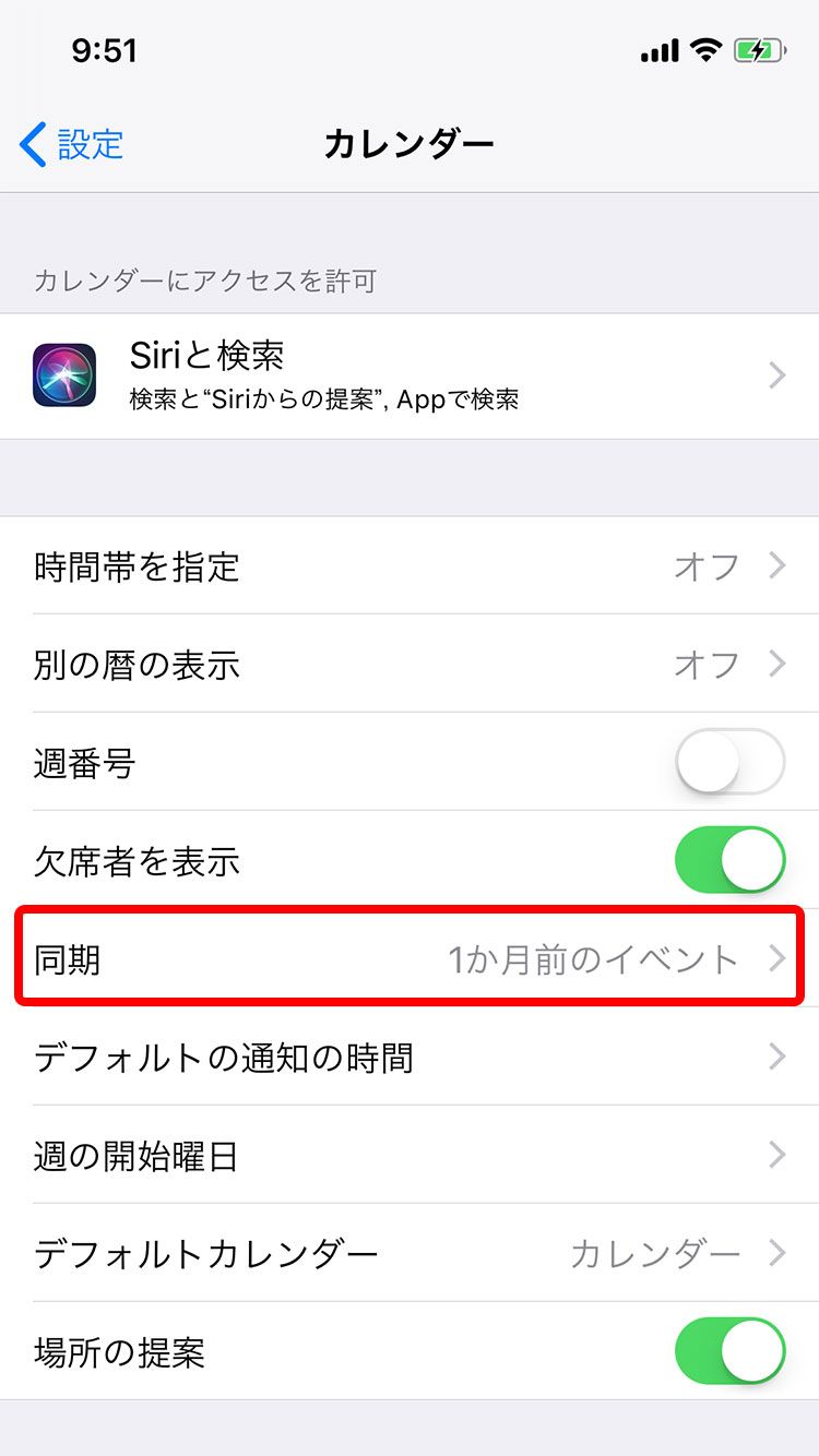 カレンダーのイベントは一定期間で非表示になるように設定されています。以下の手順を実行して同期の設定を確認、変更してください。