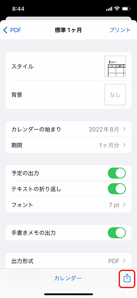 1. KAKIKO カレンダー App の プリント画面 へ進んで、[↑] をタップします。
